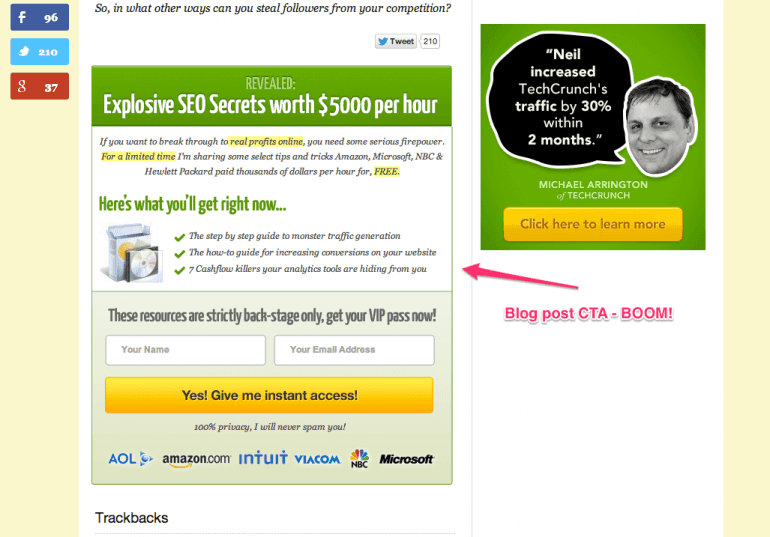 Neil Patel does a great job of asking for action from his readers at the bottom of every post. There is nothing wrong with asking as long as you are providing value to your readers.