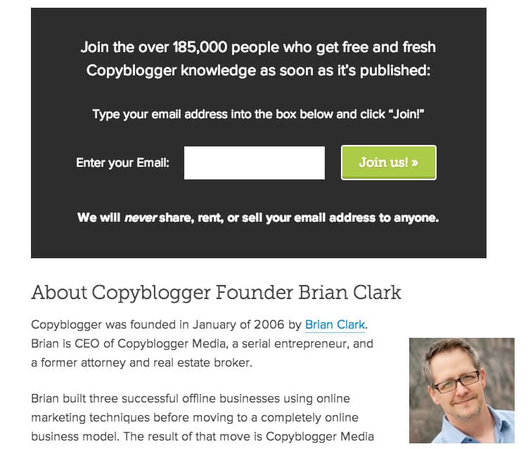 For some inspiration, take a look at how Copyblogger places an effective call to action right in the middle of their About Us page. You're telling people who you are. Why wouldn't you give them the opportunity to connect now that they've gotten to know you?