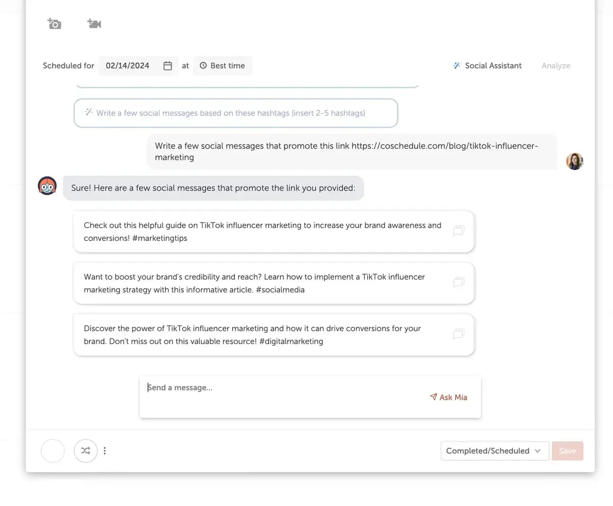 The best way to see the impact is to put it to work. Use AI-powered tools to automate workflows and refine strategies. Platforms like CoSchedule’s Social Assistant, Social Media Manager, Hire Mia, and ChatGPT help simplify the process, so you can focus on what matters most: creating content that connects.