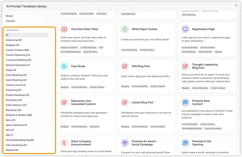 Inside CoSchedule, teams can save and reuse structured prompts to keep output consistent across contributors.