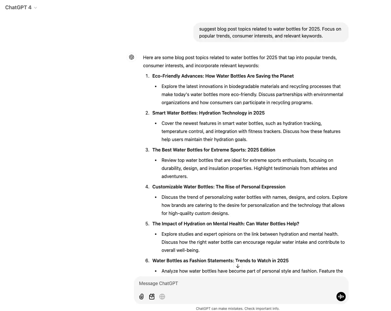 “Suggest blog post topics related to water bottles for 2025. Focus on popular trends, consumer interests, and relevant keywords.”