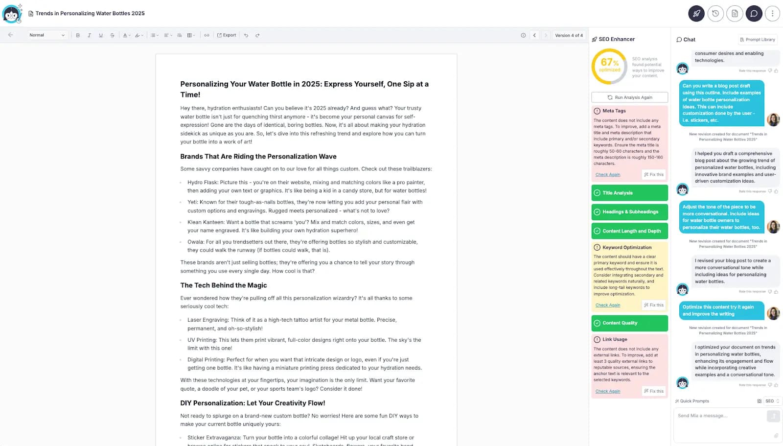 If you’re using an AI tool with built-in SEO tools, you can use those instead. In this example, we’ll use Hire Mia’s SEO Enhancer to optimize the post.