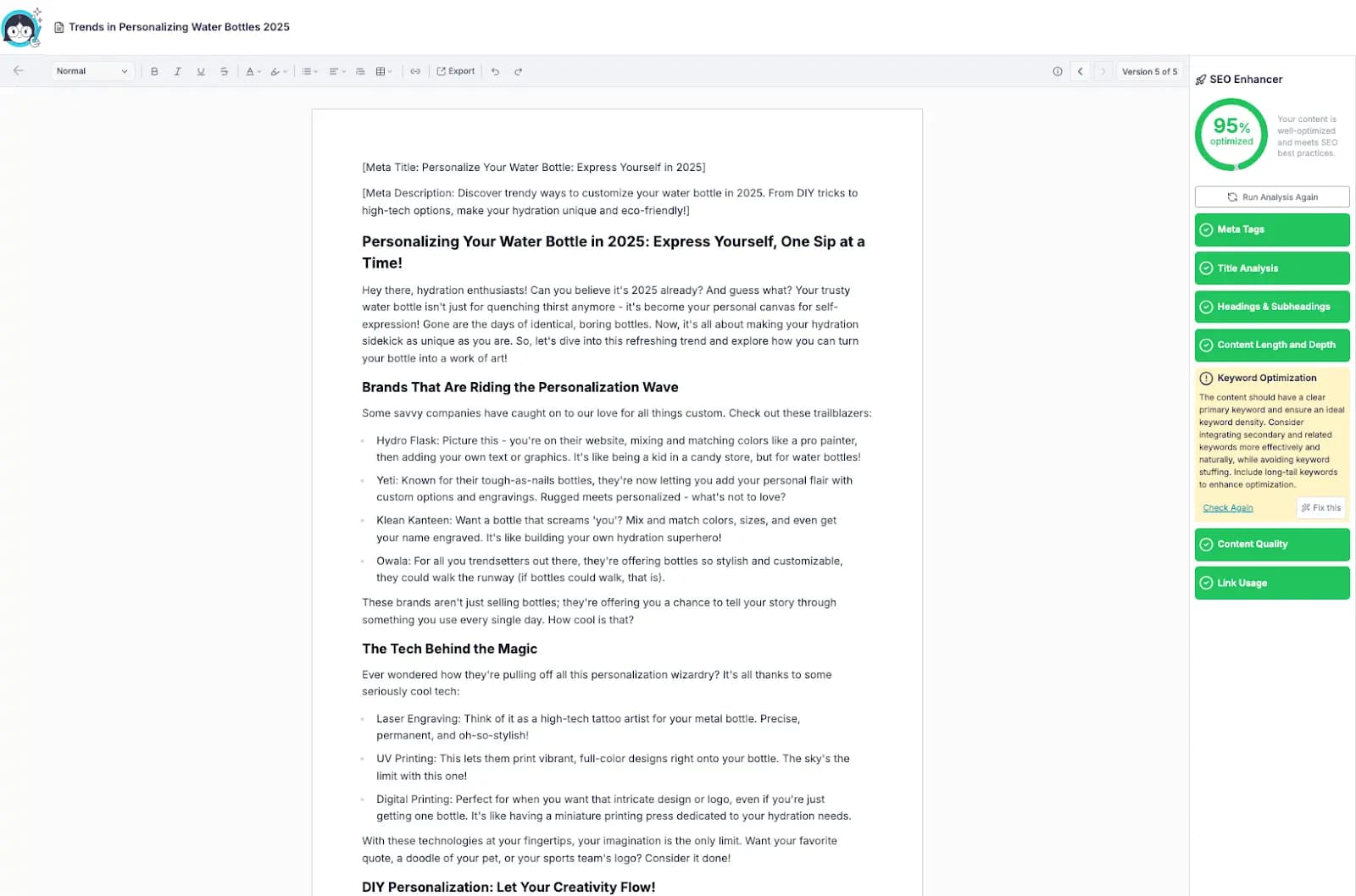 By clicking “Fix This” on the Meta Tags and Link Usage sections, the SEO enhancer optimized the content by adding a Meta Title, Meta Description, and strategic links to the blog post.