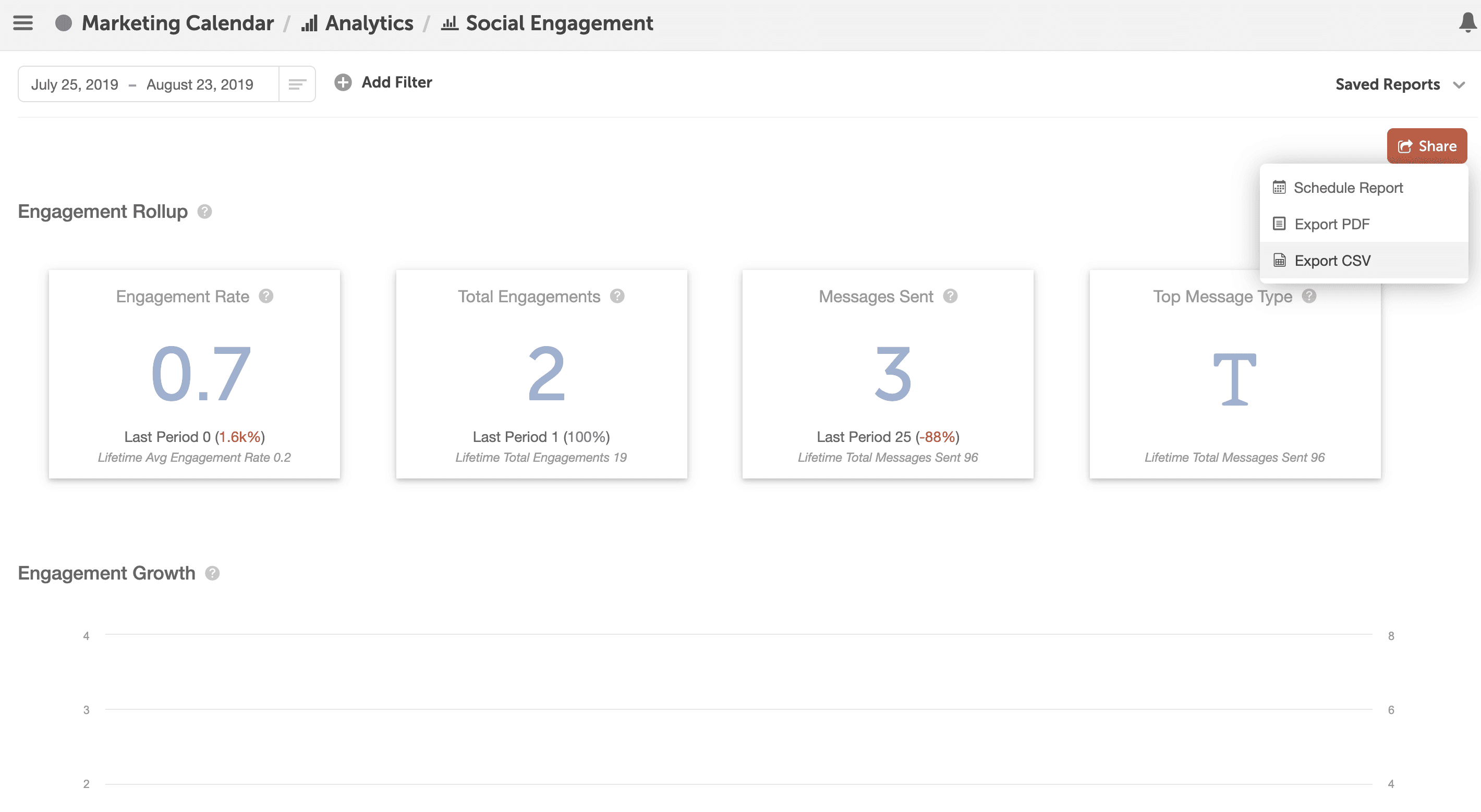 Exporting analytic reports as a CSV file is available in new Marketing Suite/Social Organizer Growth, Professional, and Enterprise plans.