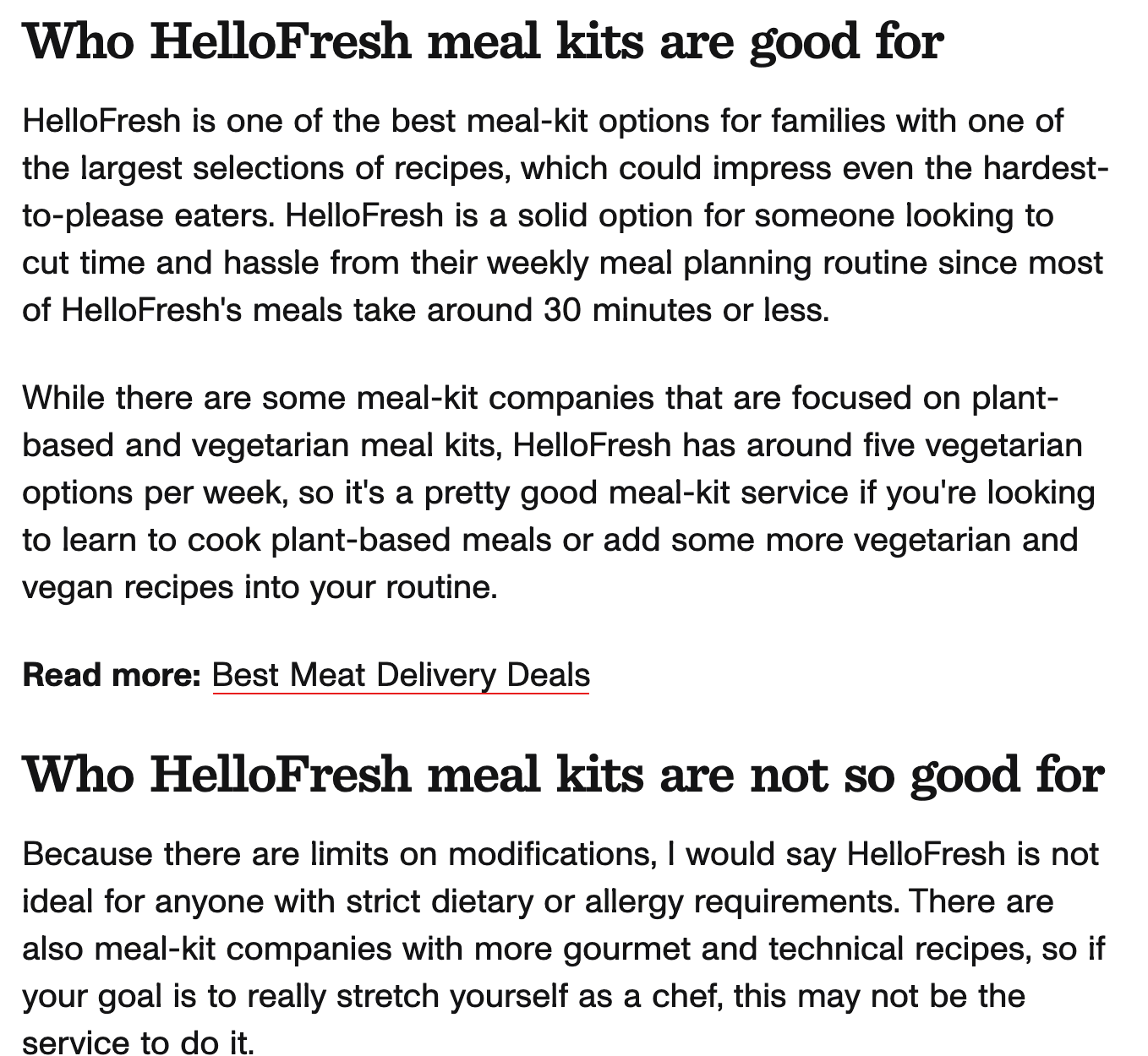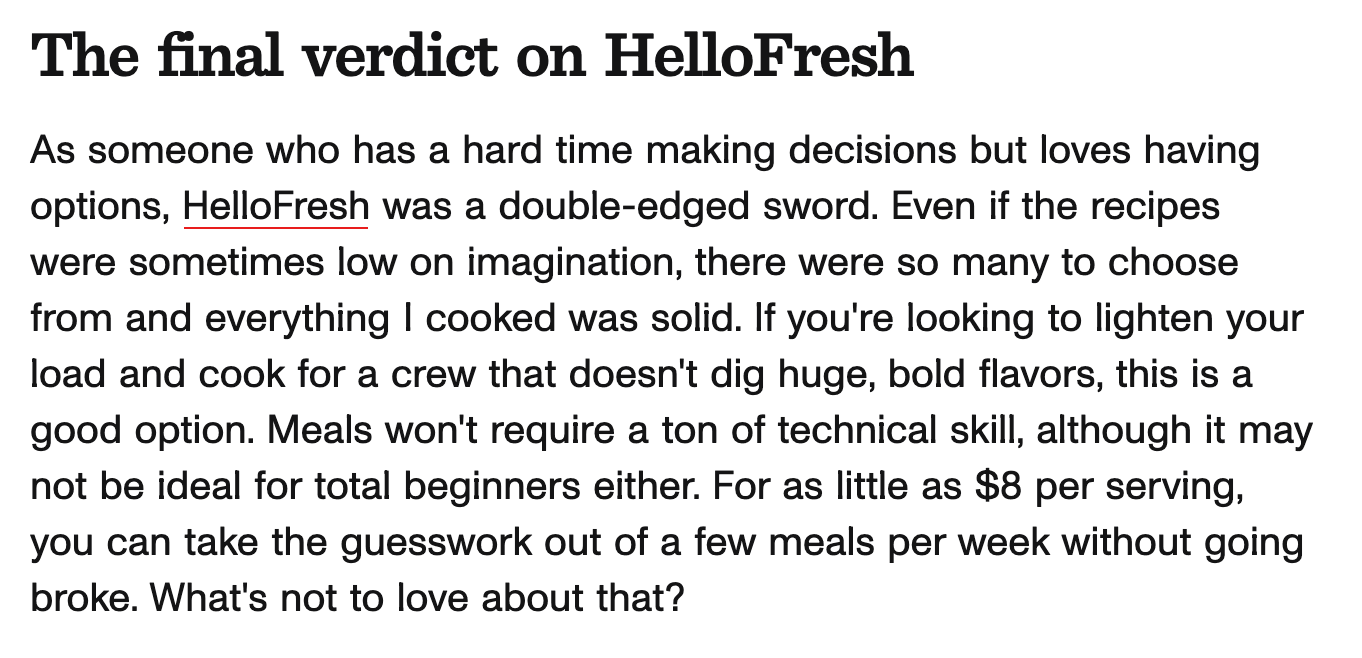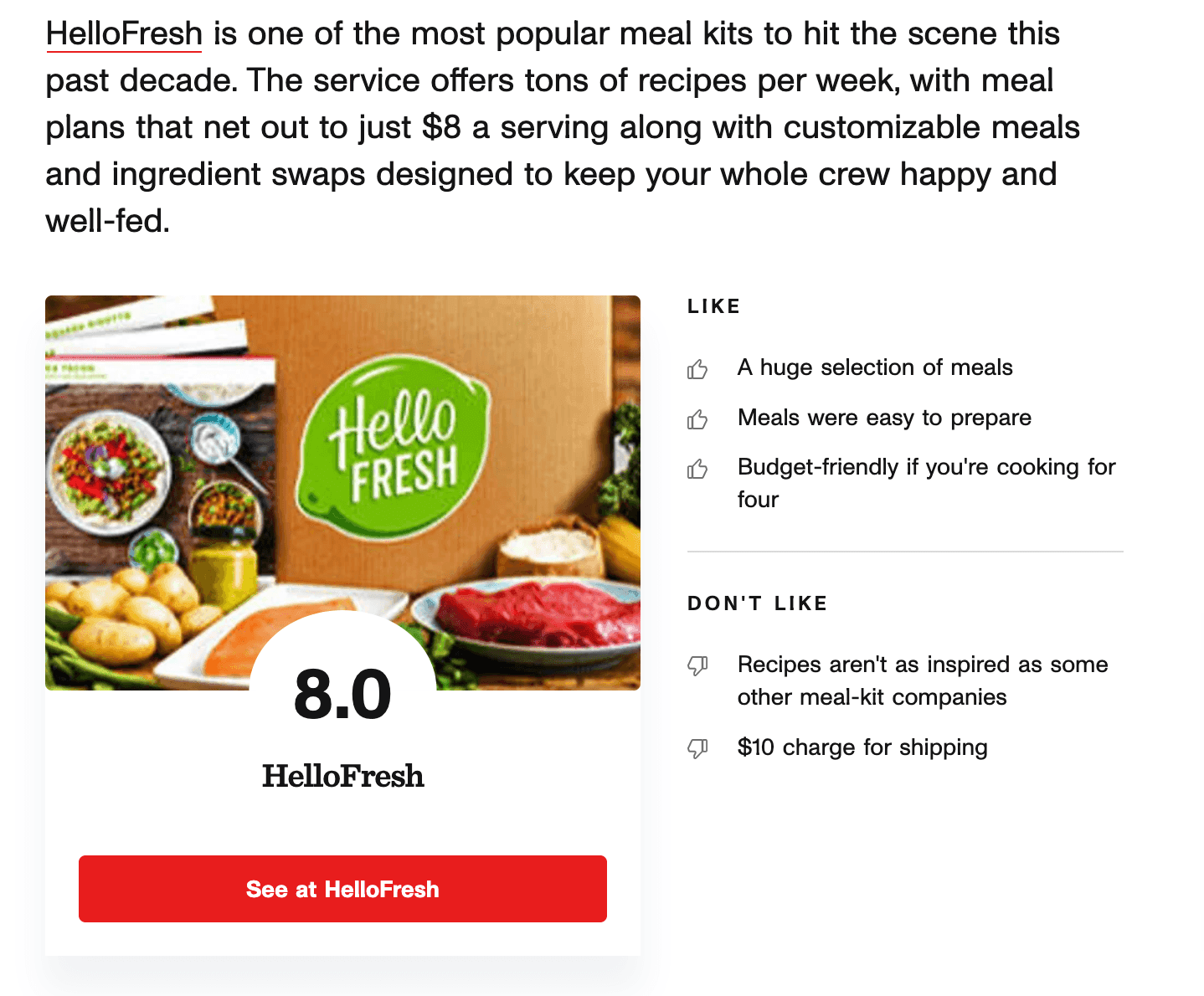 Establish authority with the audience as a reviewer by creating empathy with readers. Share an overview of the product and the features you will cover. Make it obvious if you recommend the product, and share the pros and cons. CNET’s hook provides an overview of HelloFresh and a short description of what they will address in the review.