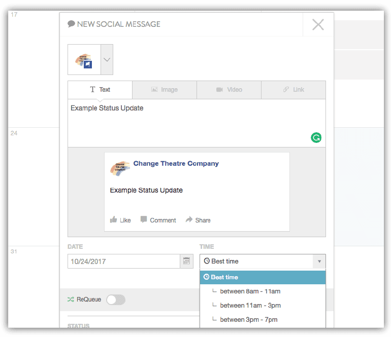 To use the Best Time Scheduling feature, create your message using CoSchedule’s Social Calendar. Next, scroll to the bottom of the post and select ‘best time’ from the drop-down menu on the right-hand side of your post.