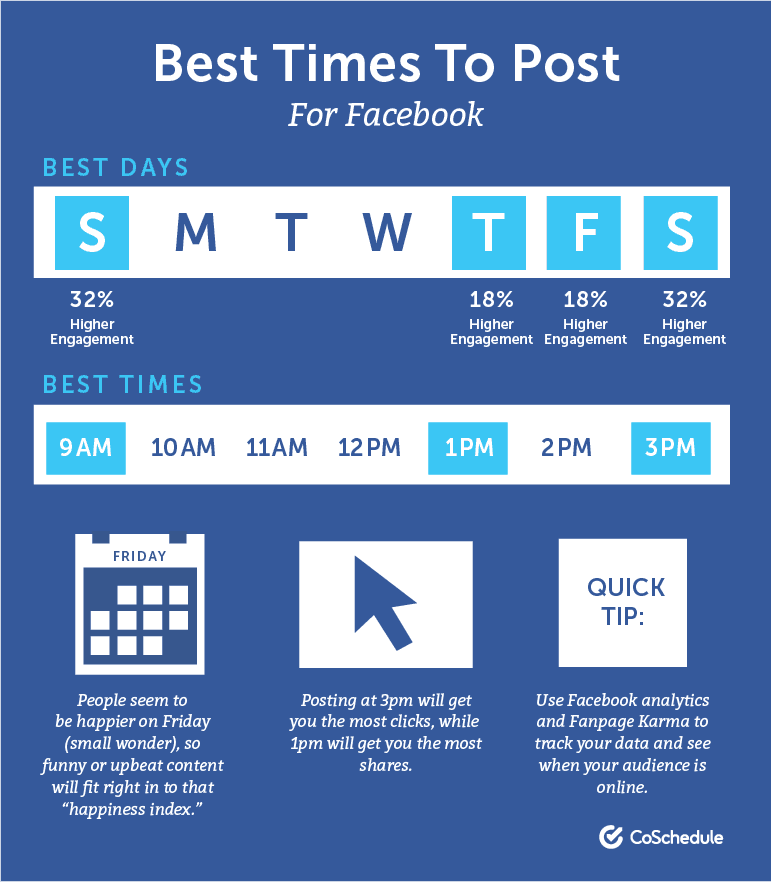 Based on our analysis of 30,000+ accounts, the best days to post on Facebook are Monday, Wednesday, and Friday. Posting on these days will help you gain maximum exposure.