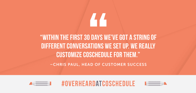 Chris: Absolutely. So, within the first 30 days we've got a string of different conversations we set up with them. We really customize CoSchedule for them. They've got a plethora of different resources, how to documentation and training information. And then really setting up different milestones on what makes the most sense to them. What are their different goals and objectives? And how do we help them knock those things out of the park within the first 90 days?