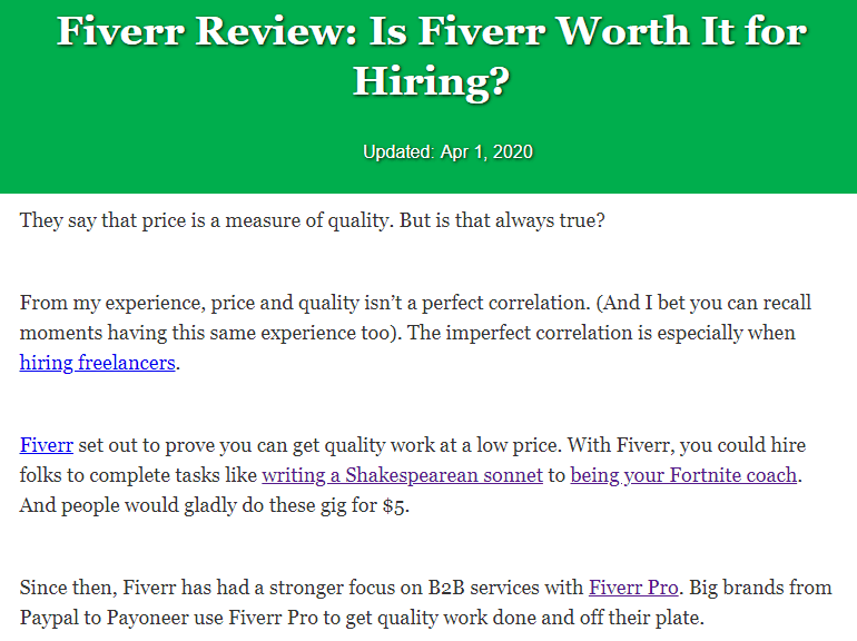 For alternative pages, you can curate either your review pages. Here’s an example from Lancer Review for alternative sites, like Fiverr: