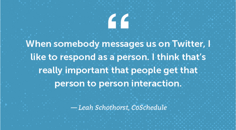 I don’t like to automate responses. When somebody messages us on Twitter, I like to respond as a person. I think that’s really important that people get that person to person interaction. It’s also a really important opportunity for companies to start building relationships not only with customers, but also with influencers. That’s something that I don’t typically automate.