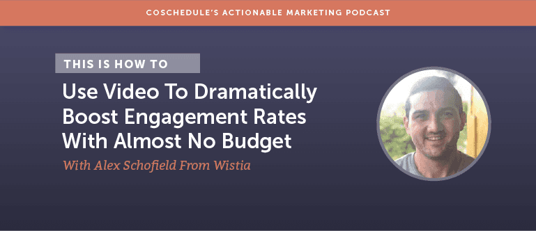 Eric: Video killed the radio star. Okay, two things. First, I promise no more singing. Sorry about that. Secondly, I don’t know about the radio star, but video is seriously killing it on almost all content marketing avenues right now. According to Cisco, by 2021, 82% of consumer internet traffic will be video. As marketers, we should be loving video. Whether it’s helping us improve SEO or increase in engagement by up to 10X, it’s producing higher retention rates and better email click-throughs. I don’t know if you’ve noticed your Facebook, Twitter, and LinkedIn feeds lately, but the social algorithms are eating video up. That’s why it’s a topic of the episode of the Actionable Marketing Podcast. My guest is Alex Schofield. He’s an Account Executive at Wistia. Wistia are juggernauts in the video arena. I can’t wait for him to share his thought leadership around video like, how do we avoid the pitfall of creating videos as one-off tactics and really create a true video strategy? Or, how do we think creatively and maybe some unique uses for video that other marketers or companies are doing? And lastly, my favorite, how do we get around this tiny little thing called a budgetary restraint? How do we make great videos for not a lot of money? That’s the secret. My name is Eric. I’m the Brand and Buzz Manager here at CoSchedule. Thanks so much for tuning into this episode. I can’t wait to dive in with Alex. All right, let’s get AMPed. Alright. I’m here with Alex. Alex, thanks so much for joining the Actionable Marketing Podcast today. Alex: Eric, thank you so much for having me. Super excited to be here with you. Eric: You bet. I’m sure this episode will come out in a couple of weeks, but it’s Happy Halloween, man. I hope it’s going to be a good one for you. Alex: I’m really excited for all the trick-or-treaters that come by my house today. I just hope I don’t eat all the candy before they get there. Eric: It’s okay if you do. Just turn off the lights and hide in the basement. You’ll be fine. You’ll be fun. Alex: I love that plan. Eric: I have to share the story before we start the podcast. You said you didn’t realize it was Halloween and you noticed a bunch of people on the train wearing onesies. I’m kind of like, “Is that how people in Boston are dressed nowadays?” Alex: Yup, sometimes you do see that on the train here in Boston. You never know what you’re going to get, but today was a bit more on the onesie train than usual so I knew something was up. Then it kind of snapped in my head that, “Oh, today is Halloween.” Eric: Today is Halloween. I’m going to shoot myself for saying this, a spooktacular episode with Alex. Oh boy, I can’t believe I did that. But we’re going to talk about video and I’m so excited to have you on. Alex, if you could, I would love for our audience just to get to know you a little bit, talk about your experiences, your role at Wistia. Alex: Yeah, absolutely. I am an Account Executive over at Wistia and for those of you who are listening, who are unfamiliar with Wistia, we’re a video platform that really allows you to creatively and effectively meet your marketing and sales goals by using video. My role as Account Executive over here at Wistia, it's a little bit different than your typical sales role when you think of that term, because really, my job day-in and day-out, is working with our customers, to help them not only develop but implement their video marketing and video sales strategy. I’ve been with Wistia for about a year-and-a-half now and it’s been an awesome treat. I almost made a trick-or-treat there. Eric: You were tempted. Alex: I was very tempted. But no, it’s been an absolute fantastic experience. I’ve really fallen in love with video and everything that can do for business. I’m really happy to share all my insights with all the awesome listeners.