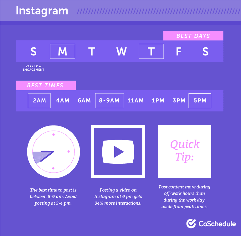 Instagram audiences are more engaged throughout the week. Quick Sprout found that Instagram engagement is fairly steady, with slight increases on Monday and decreases on Sunday. So, Mondays should get a little more attention since it's the beginning of the week. Here are the best times to post on Instagram: