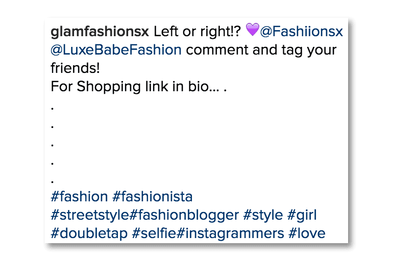 You didn't think hashtags were just for Twitter, did you? Hashtags allow users to stumble across your Instagram page by searching for hashtags. If a user is interested in marketing, they can type #Marketing into the Instagram search bar and find posts related to marketing. Posts with at least one relative Instagram hashtag average 12.6% more engagement than posts without a hashtag. So, if you want to get more likes on Instagram, hashtags are a great place to start! Although Instagram allows up to 30 hashtags per post, try to keep it around 5-10 so you don't come across as spammy. Or else you can hide your hashtags, so they can’t look spammy! Make them invisible by preceding them with four or five periods, each one on a line by itself.