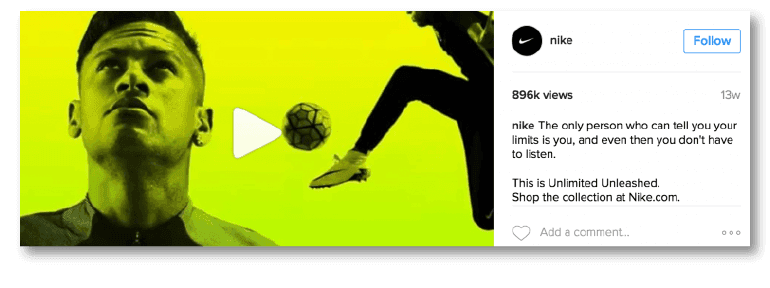 Although there have been updates to Instagram's algorithm, videos are still great for engagement if executed correctly. Earlier this year, Instagram videos went from being 15 seconds long to 60 seconds long. Instagram videos are similar to Instagram stories, except they last forever rather than 24 hours. So make sure your video is creative and entertaining. Nike has taken advantage of the video trend: