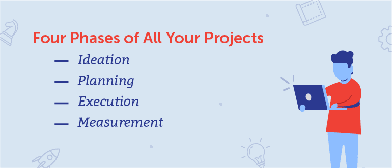 The next template in your bundle is your project timeline template. This template will help you break down each one of the projects and campaigns that you listed in your annual marketing timeline. Why is a project timeline like this so critical? Each one of your projects is going to have multiple moving parts that can become hard to keep track of. Your project timeline will help you see all of those moving pieces on a project or campaign-based level. This provides a more granular view of each project’s timeline, giving anyone working on each one visibility on when their part is due. Your projects will be broken down into four phases:- Ideation