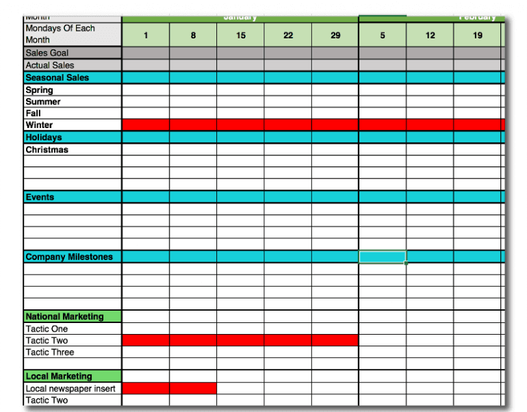 After you’ve determined your tactics, highlight each week of a sale that you’re going to be using a particular tactic, so it looks something like this.