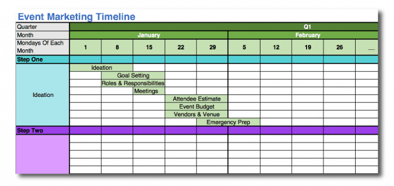 The last template in your bundle is your marketing event timeline template. This template will help your team organize an event from start to finish. Why is a timeline like this important? Even if it is small, there are still lots of moving pieces that need to be taken care of in order to execute an event smoothly. Your timeline can help keep you on track and allow you to plan ahead for what is coming next.There are lots of moving pieces that need to be taken care of in order to execute an event smoothly.