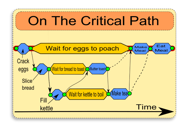 While Waterfall and Agile focus on process and tasks, Critical Chain/Path aims to solve resource issues. It is best suited for teams who have flexible skill sets and can move within the project fluidly. Each project begins by setting out a chain of items that are fundamental to the project (the critical chain/path). Then, milestones and completion dates are estimated based on the critical path/chain. After the critical path has been determined you can figure out what the least amount of time is necessary to complete a task. In other words, the critical path is the longest amount of time it will take to complete the project’s tasks. Here’s an example of what the critical path for making breakfast would look like.