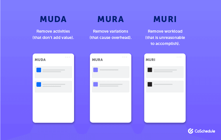 - Muri is about removing workload – according to Lean, the optimal capacity is 60-70%; any more than that actually slows productivity. Marketing teams can apply this by limiting work-in-progress through a Kanban board.