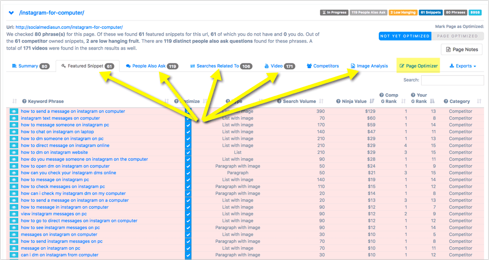 The tool also includes a page optimizer that brings everything together helping you optimize your content for all kinds of existing organic opportunities (including featured snippets, “People Also Ask”, images, videos, etc.)