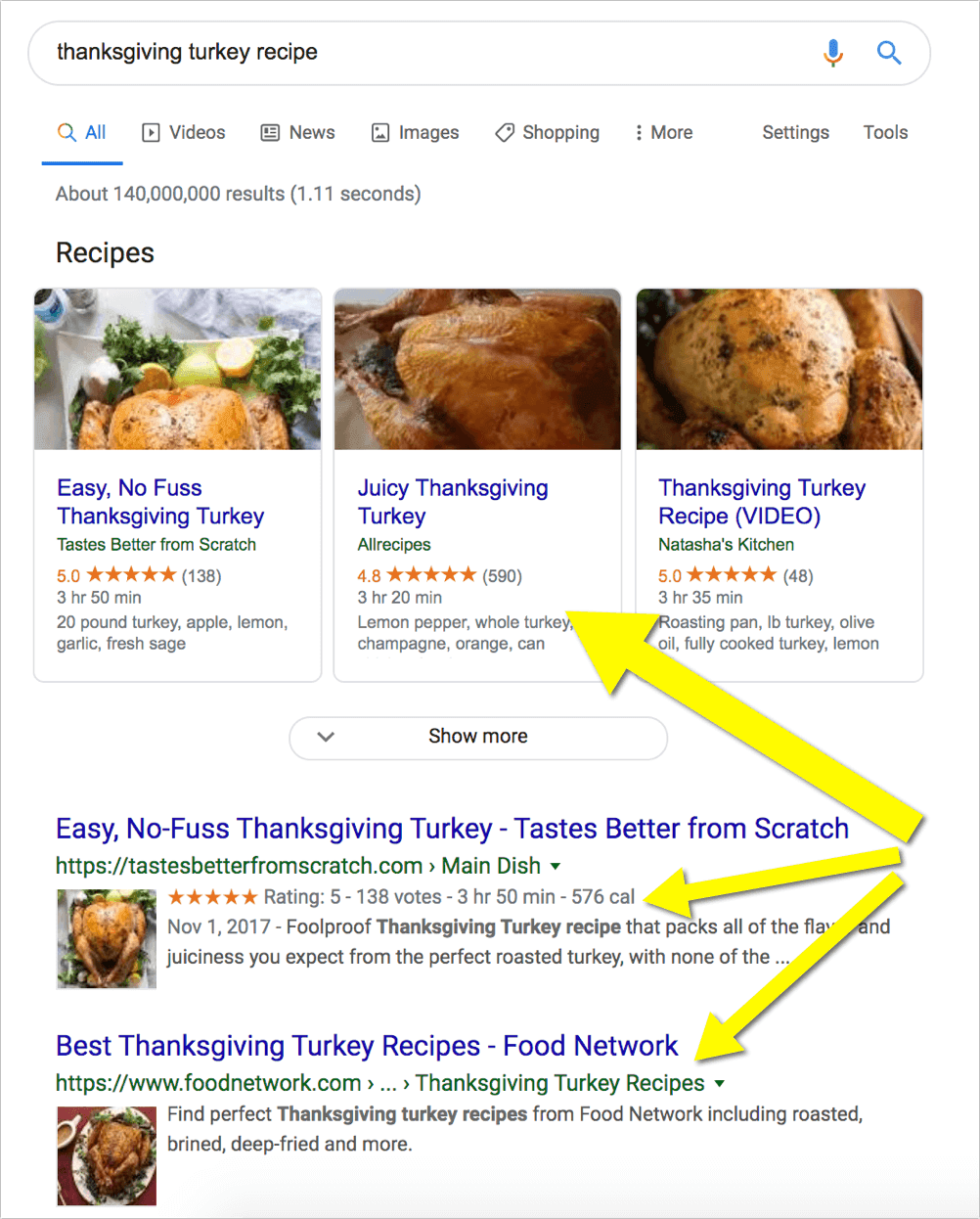 [Both recipe carousel and recipe rich snippets are generated from on-page schema.org code]