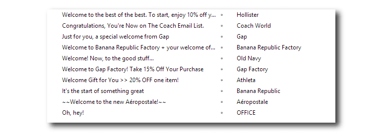 Subject lines are also important. They can be welcoming, thankful, and back up any sort of discounts or promotions you offered at sign-up. Exclusivity, “special” mentions, etc., can play key roles in subject line effectiveness as well.