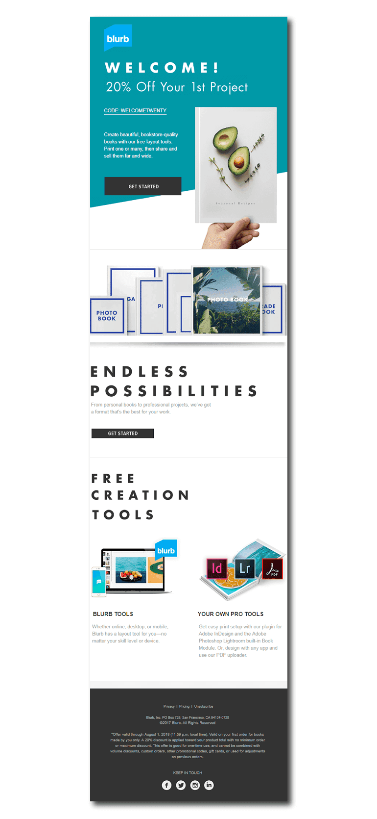This welcome email from Blurb uses concise text and imagery to give a clear idea to the subscriber about what to expect.