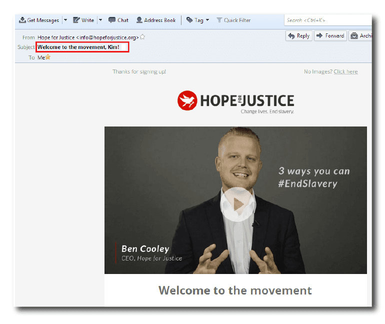 Hope For Justice is a non-profit organization that has used ‘first name personalization’ in their welcome email subject line, thereby enhancing the open rates.