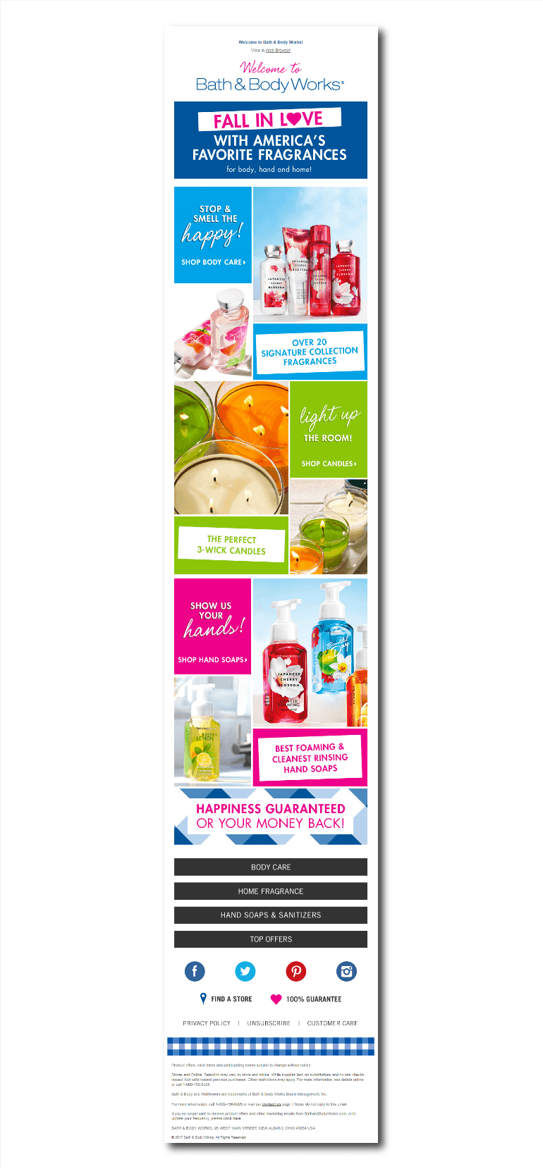 A warm welcome with solid, prominent CTAs, links to important categories, and social buttons in the footer.