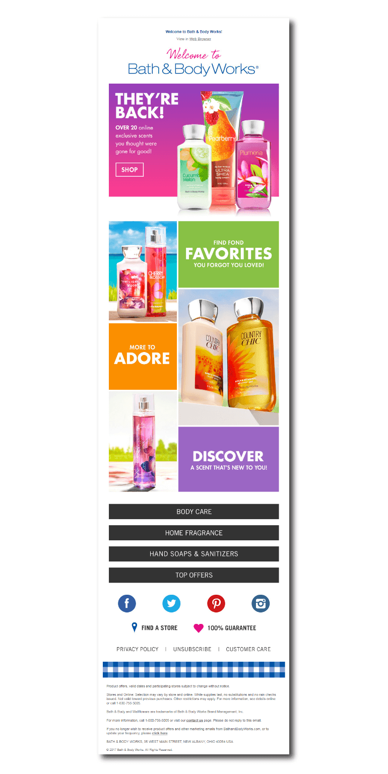 Boden welcomes the new subscriber by telling the subscriber about the benefits they will be enjoying by joining the brand’s email list. They also offer a 15% welcome discount and free shipping. They complete the package by providing links to social platforms in the footer.