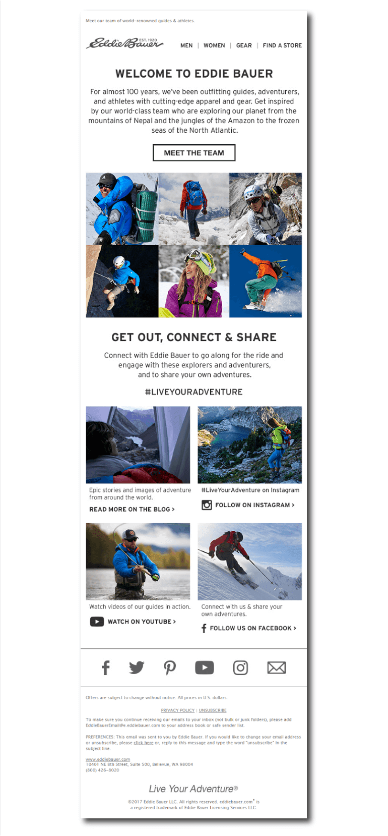 Eddie Bauer includes one primary CTA that allows the subscribers to meet their team, with additional supporting CTAs that urge readers to involve themselves more into the brand on their social channels and blog.
