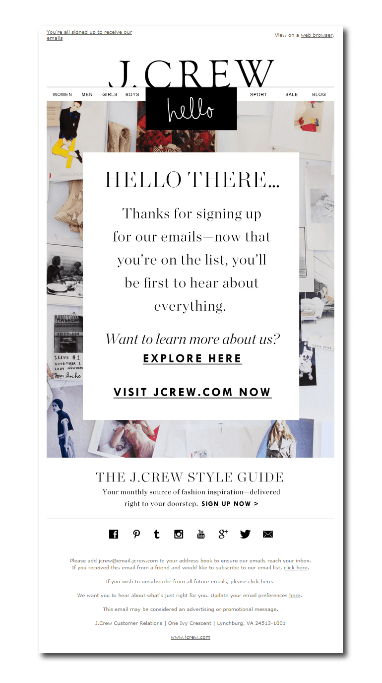 J. Crew keeps it simple. They nudge the subscriber to explore their website through two links (they could test CTA buttons). Through a secondary offer, the subscriber can also sign up for the style guide. Social buttons are included in the footer but are not prominent.