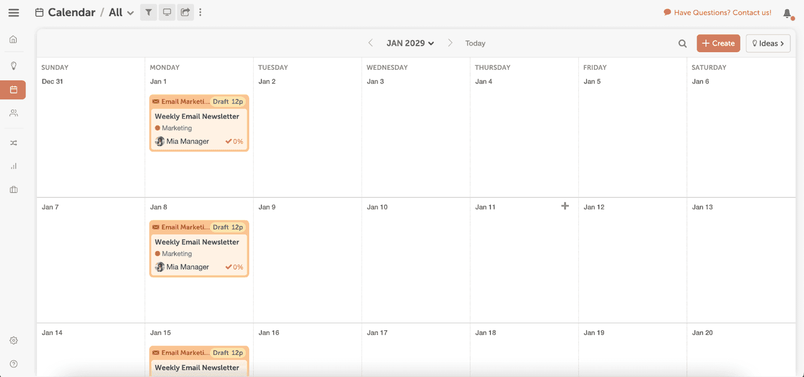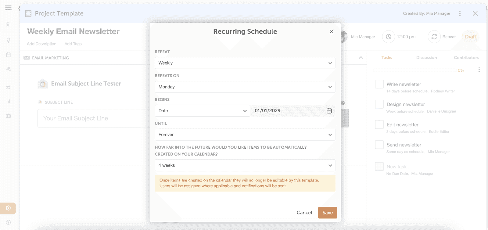 Newsletters typically have regular sending cadences, such as weekly or monthly. With CoSchedule Marketing Suite, you can create a recurring project for newsletters like this: