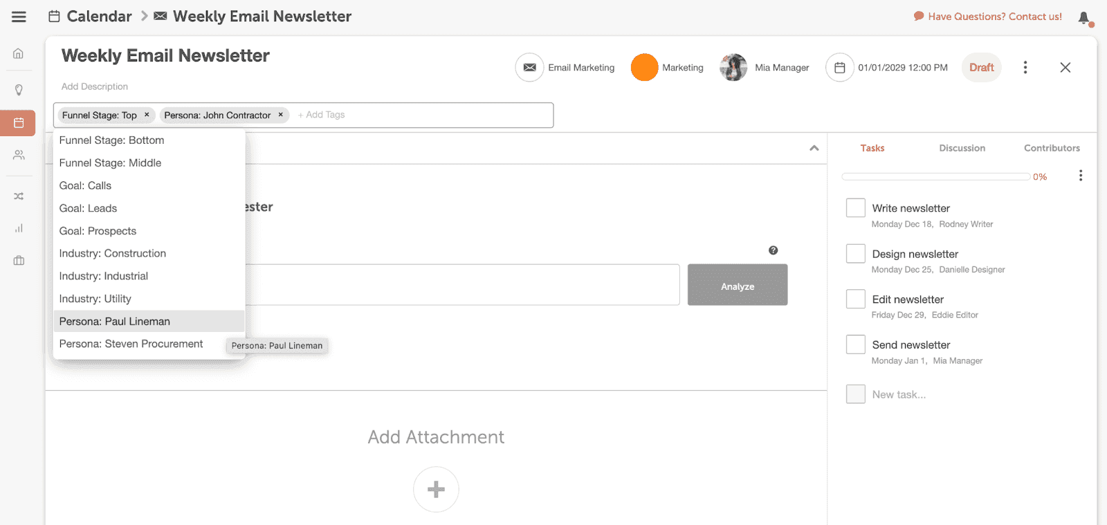 With CoSchedule Marketing Suite, you may customize segments with any internal language that is helpful for segmentation, such as personas and funnel stages: