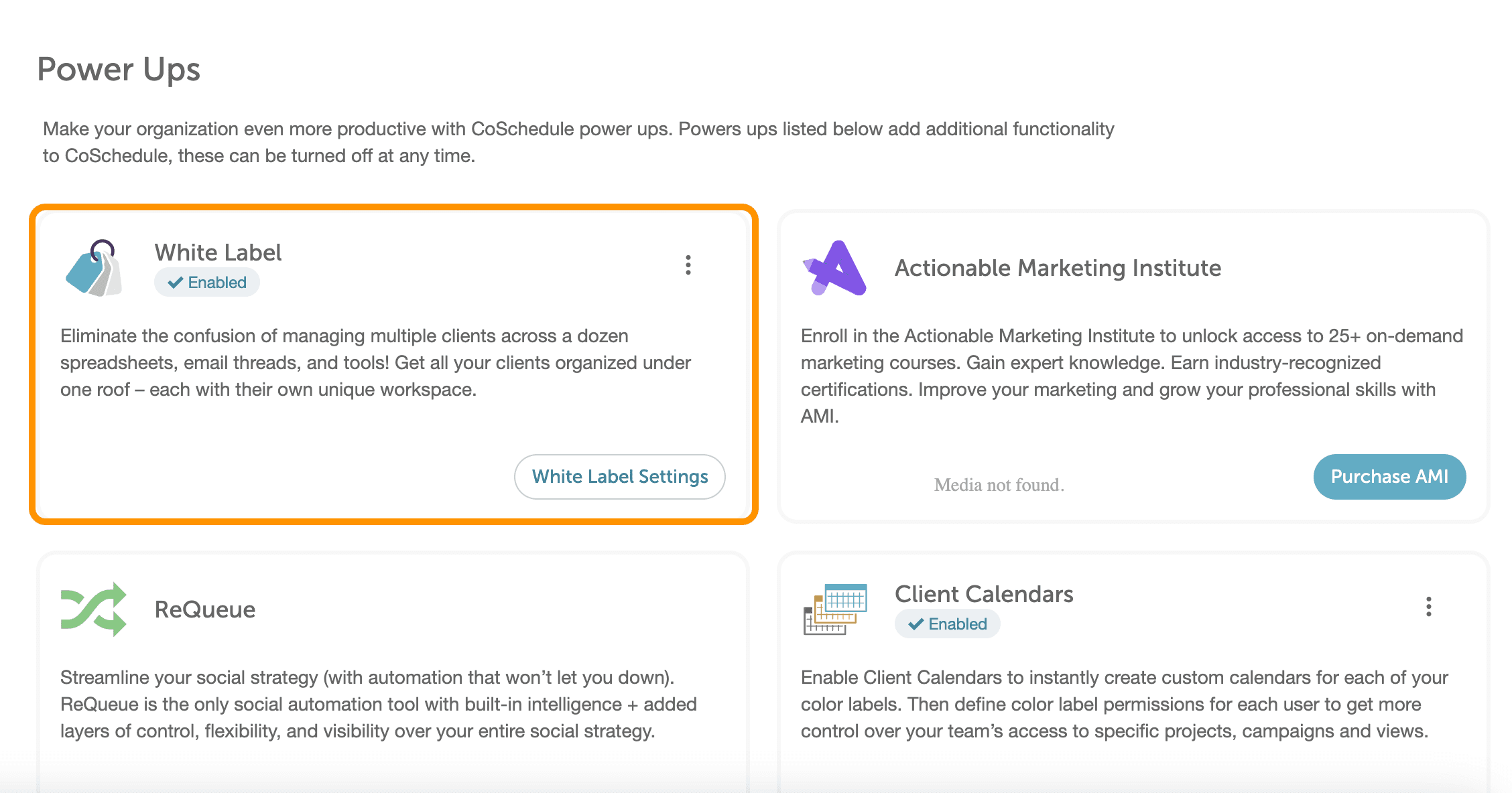 CoSchedule’s White Label feature allows you to customize your reports with a different logo for each client. So the first thing you’ll need to do is enable White Label from the Power Up section in your Settings. Once enabled, you can add your client names and logos. The Customized Branding section will display all reports & read-only calendars.