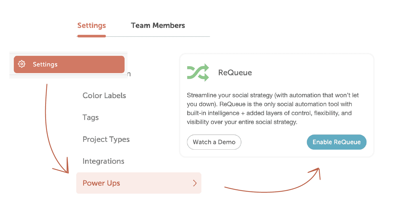 To enable ReQueue, select your name in the hamburger menu and click on Calendar Settings. Select Power Ups in the left-hand menu, and then click on Enable ReQueue.