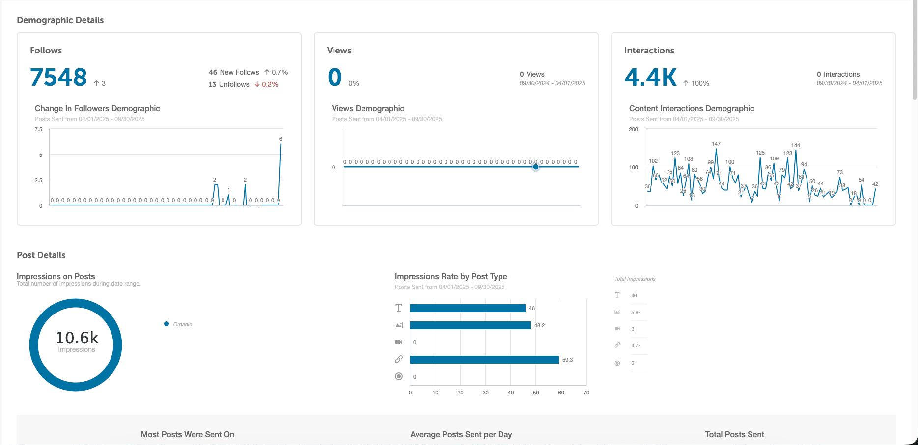 Social Profile Reports give you insights into each profile’s follower count, best times to post, best days to post, and best message types. You can use this data to improve your social media strategy for each specific profile.