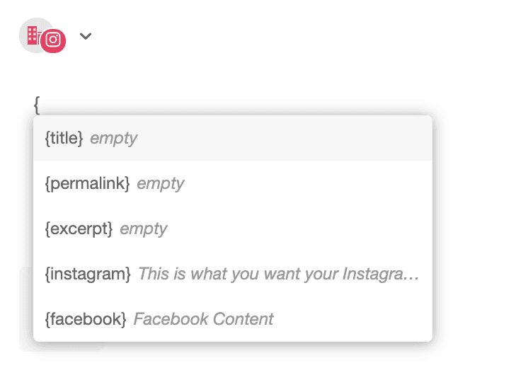 6. Select the squiggly bracket { on your keyboard and your list of Social Helpers will display, along with the default Social Helpers (Title, Permalink, and Excerpt).