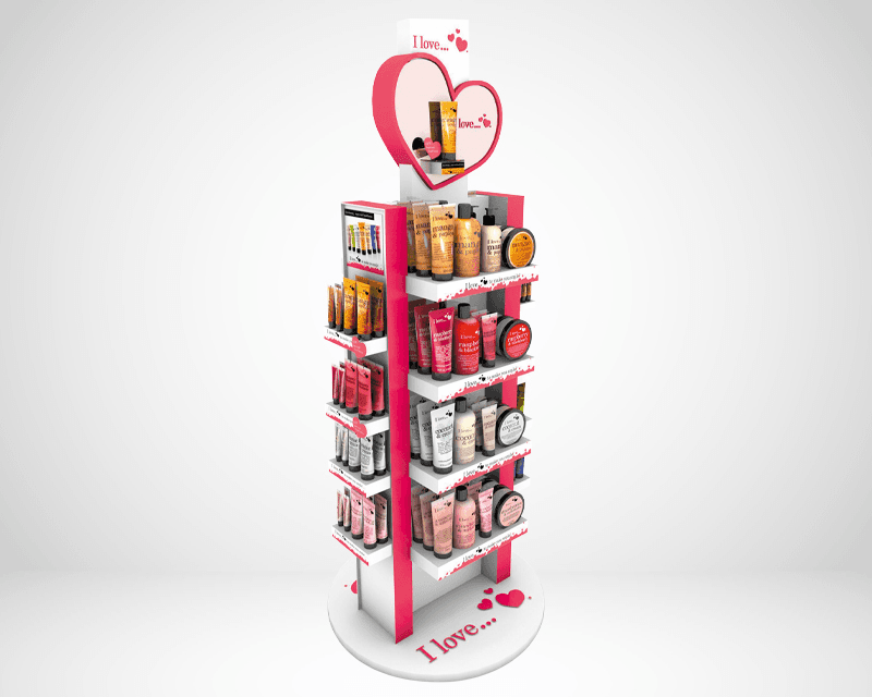 This is an example of a PoP display created by KSF global to draw attention to a specific brand of beauty products. It is an effective retail marketing idea because people are more attracted to items that are easier for them to notice.