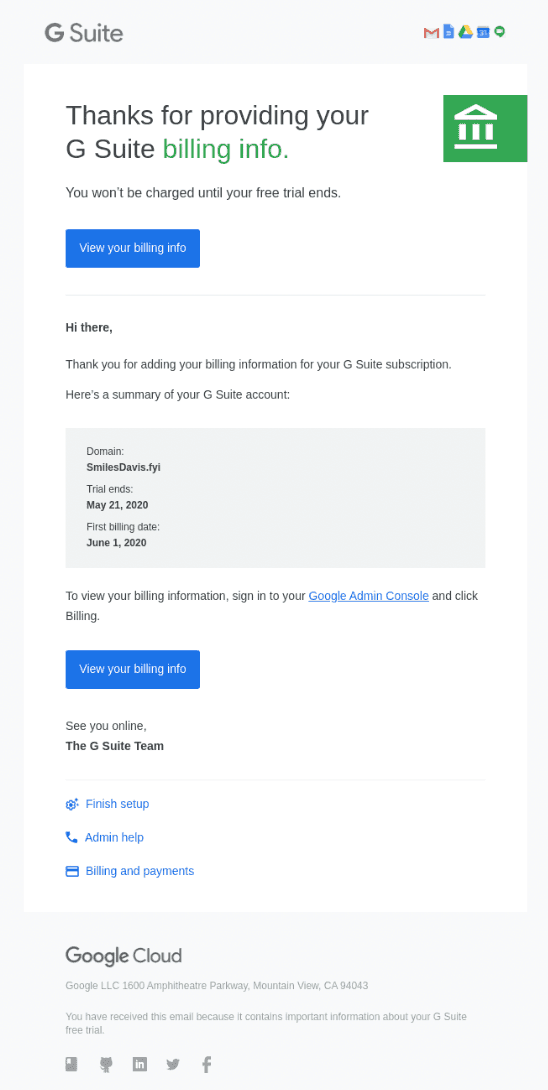 G Suite uses email to manage customer transactions. Users can view and amend their billing information and access customer support through one email.
