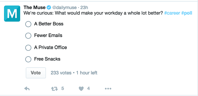 The Muse uses Twitter polls to ask its audience what would improve their workday. It can use this information to create additional content based on their replies.