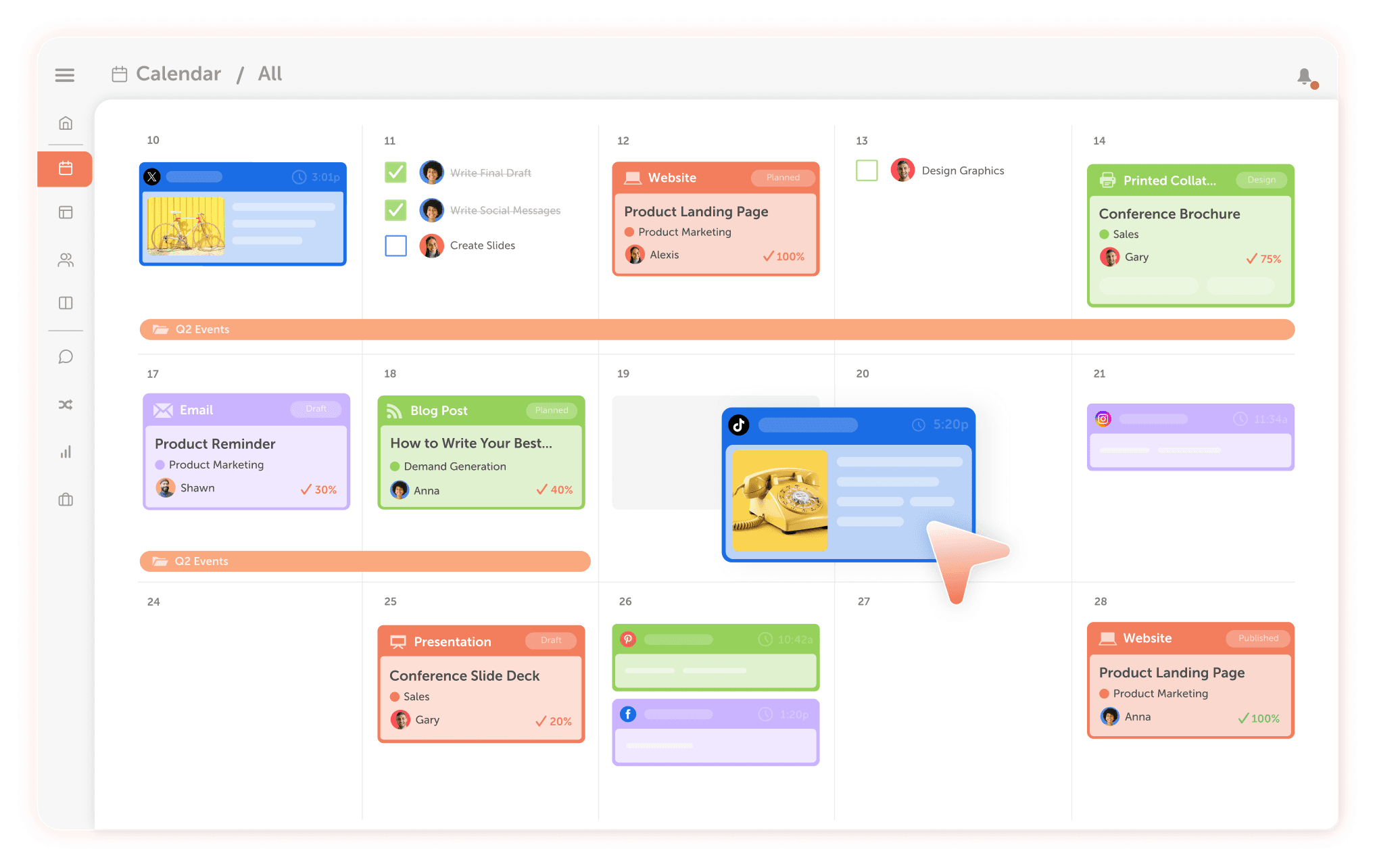 This is why your “simple project timeline template Excel” file won’t scale as your workload grows. Marketing today isn’t linear—it’s multi-channel, fast-paced, and constantly changing. A static template can’t support content calendars, social publishing, campaign launches, or cross-team collaboration.