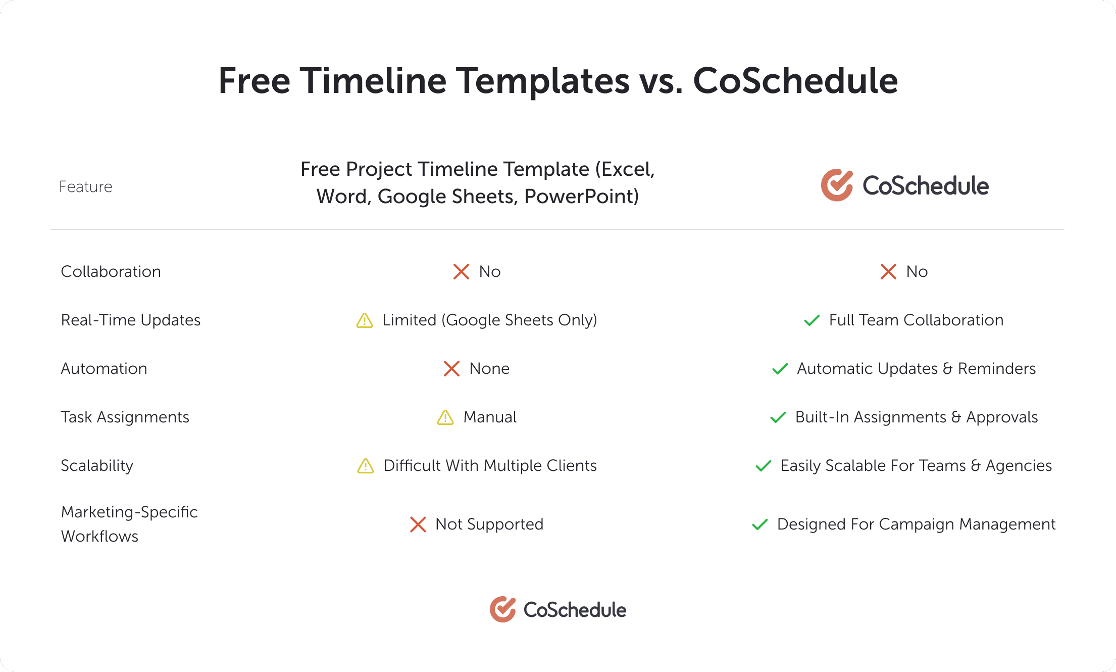 So what if your project timeline template wasn’t just a static file? What if it could be interactive, collaborative, and built to scale? Let’s explore why traditional templates fall short and how CoSchedule helps marketing teams turn any project timeline into a live workflow.