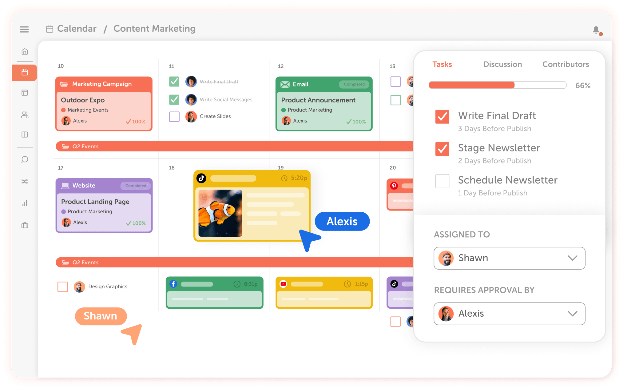 - Assignments, approvals, and checklists: Keep collaboration and accountability built into your timeline.