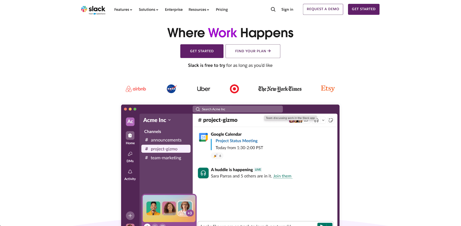 Marketing teams use Slack to meet and discuss over text. This software excels at instant messaging and asynchronous collaboration because of its customizable channels. But remember that you’ll need a paid plan if you want a long-term archive of your messages.
