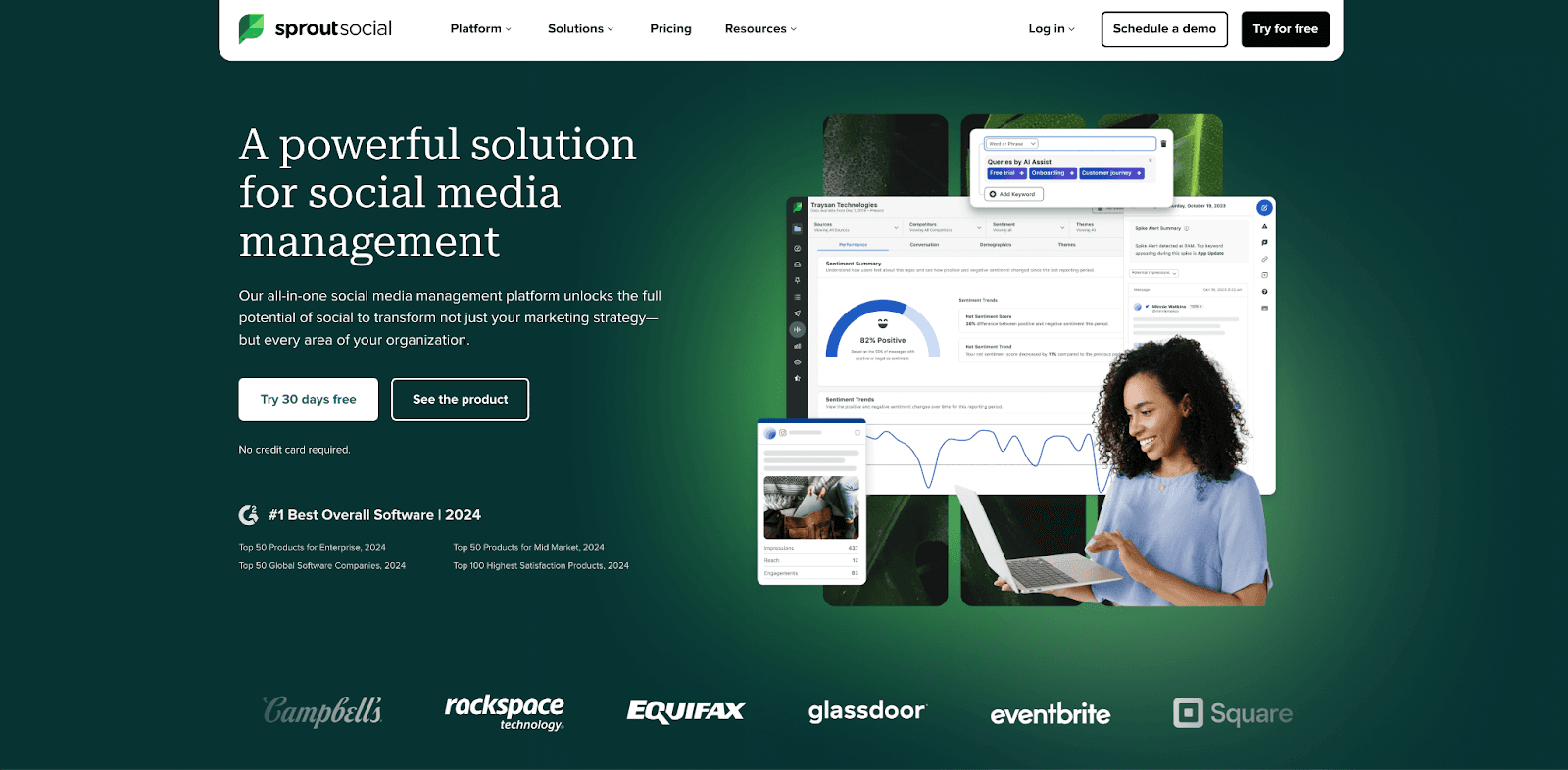 SproutSocial serves as an all-in-one social media management tool. In addition to the scheduling, publishing, and analytics features you’d expect, it offers a managed DM inbox and social listening. Plus, its employee advocacy tools provide resources that help your team members share your social content.