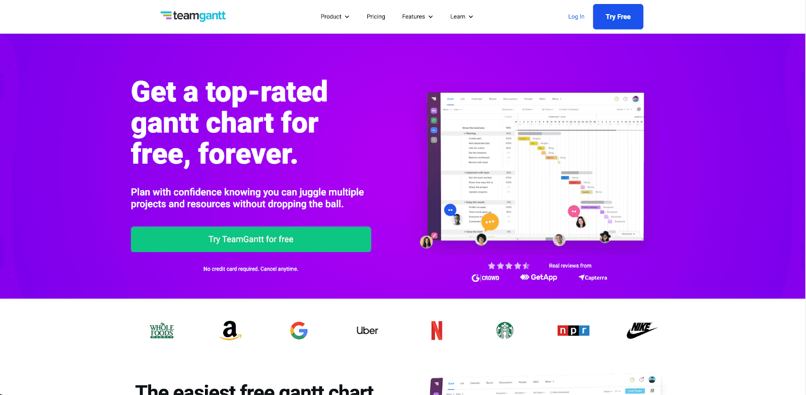 As its name suggests, Team Gantt organizes your work into a dynamic Gantt chart. The Gantt chart format places all of a project’s steps into an ongoing timeline. TeamGantt kicks that visualization up a notch with features like commenting, task dependencies, and resource management.